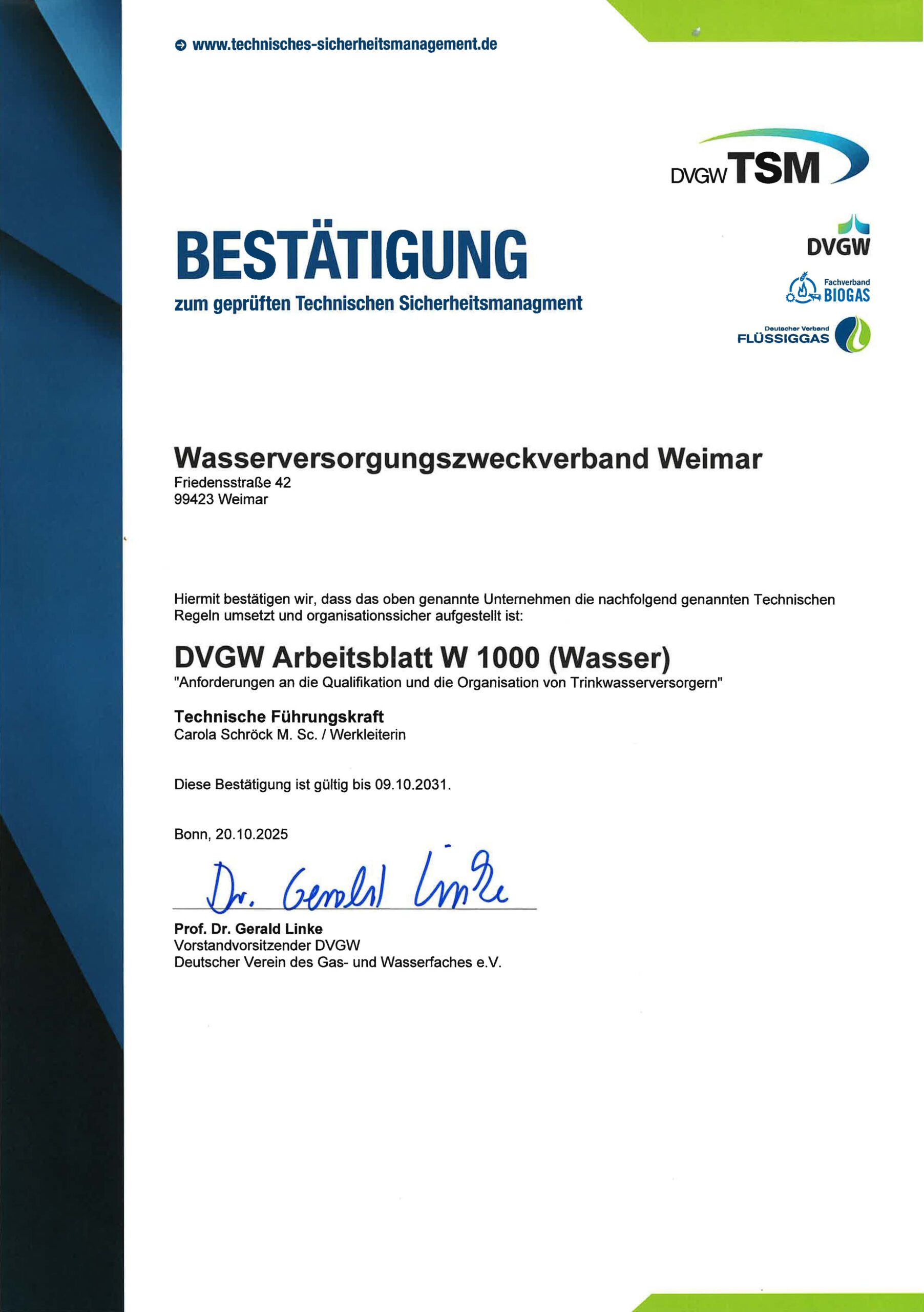 Der Wasserversorgungszweckverband Weimar hat sich im Oktober 2025 erfolgreich der TSM-Überprüfung gestellt. Am 10. und 11. Oktober 2025 wurde die Rezertifizierung von zwei seitens des DVGW benannten Experten vorgenommen. Im Ergebnis war der Werkleitung schriftlich mitgeteilt worden, dass die Anforderungen seitens des WZV Weimar erfüllt sind. Die offizielle Überreichung der Urkunde wird im Rahmen des 31. Thüringer Wasserkolloquiums am 5. März 2026 im Erfurter Steigerwaldstadion stattfinden.